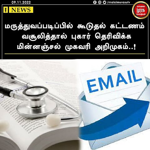 மருத்துவப்படிப்பில் தனியார் மருத்துவ கல்லூரிகள் கூடுதல் கட்டணம் வசூலித்தால் புகார் தெரிவிக்க மின்னஞ்சல் முகவரி அறிமுகம் செய்யப்பட்டுள்ளது.