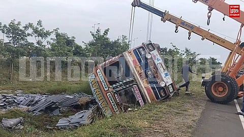 தாம்பரம் அடுத்த எருமையூர் செக்போஸ்ட் அருகே, லாரியில் ஆந்திரா கடப்பாவில் இருந்து கடப்பா கல் ஏற்றிக் கொண்டு வந்த போது கட்டுப்பாட்டை இழந்த லாரி சம்பவ இடத்தில் சாலையோரம் பள்ளத்தில் கவிழ்ந்தது.