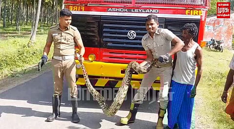 இதனை கண்ட இளவரசு போச்சம்பள்ளி தீயணைப்பு துறையினருக்கு தகவல் அளித்துள்ளார். அதன் பேரில் போச்சம்பள்ளி தீயணைப்பு வீரர்கள் மலைப்பாம்பை லாவகரமாக பிடித்து சாக்குபையில் கட்டி எடுத்து சென்று தொகரப்பள்ளி காப்புகாட்டில் விட்டனர்.