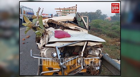 அப்போது சென்னை-திருப்பதி தேசிய நெடுஞ்சாலை லட்சுமாபுரம் பகுதியில் வளைவில் திரும்பும் போது எதிரே சரக்கு ஆட்டோ வெளியே நீட்டிக் கொண்டு வந்த இரும்பு தளவாடத்தில் மோதி தலைகுப்புற கவிழ்ந்து விபத்துக்குள்ளானது.