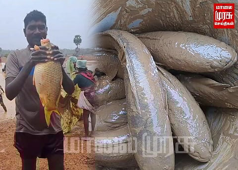 சிவகங்கை | மானாமதுரை அருகே நத்தபுரக்கி கிராமத்தில் கொட்டும் மழையிலும் மீன்பிடி திருவிழா நடந்தது. நத்தபுரக்கியில் 50 ஏக்கர் பரப்பளவிலான வானம் பார்த்த கண்மாய் உள்ளது.