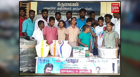 மயிலாடுதுறை | நடிகர் விஜய் நடித்துள்ள வாரிசு திரைப்படம் நாளை திரைக்கு வர உள்ள நிலையில் ரசிகர்கள் பல்வேறு விதமான கொண்டாட்டம் மற்றும் பிரார்த்தனைகளில் ஈடுபட்டு வருகின்றனர். அதன் ஒரு பகுதியாக தரங்கம்பாடியில் உள்ள கிருபாலயம் மன வளர்ச்சி குன்றிய காப்பக பள்ளியில் விஜய் ரசிகர்கள் வாரிசு திரைப்படம் வெற்றி பெற வேண்டி பல்வேறு நலத்திட்ட உதவிகளை வழங்கினர்.