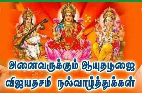 இதன்படி, பொதுமக்கள் தங்களது வீடுகளில் பூஜைகளை செய்து வழிபாடு நடத்தி வருகின்றனர். இதையடுத்து, விஜயதசமி நாளை கொண்டாடப்படுகிறது. ஆயுத பூஜை மற்றும் விஜயதசமியை முன்னிட்டு தமிழக மக்களுக்கு ஆளுநர், முதலமைச்சர் உள்ளிட்ட தலைவர்கள் வாழ்த்து தெரிவித்துள்ளார்.