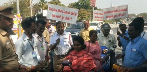 தமிழ்நாடு அரசு போக்குவரத்து கழகத்தினர், ஹெல்மெட் அணிய ரோஸ் கொடுத்து இருசக்கர வாகன ஓட்டிகளுக்கு நூதன விழிப்புணர்வு ஏற்படுத்திய சம்பவம் பரபரப்பை ஏற்படுத்தியது.