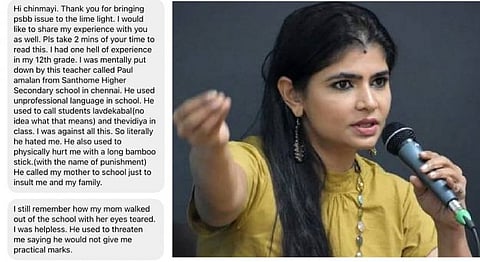 பாடகி சின்மயி மூலமாக பிஎஸ்பிபி பள்ளி ஆசிரியரின் பாலியல் தொல்லை வெளிச்சத்துக்கு வந்த நிலையில், அவரிடம் மேலும் ஒரு பள்ளியை சேர்ந்த மாணவி தனது குமுறல்களை முன்வைத்துள்ளார்.