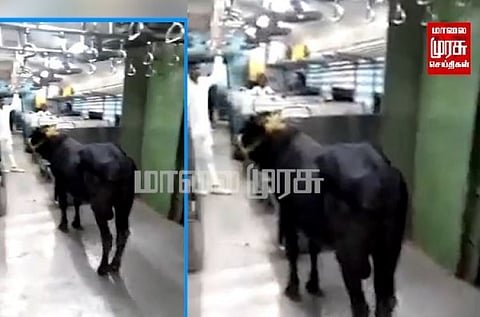 ஜார்கண்ட் மாநிலம், சாஹிப்கஞ்ச் மற்றும் பீகாரின் ஜமால்பூர் இடையே ஓடும் பயணிகள் ரயிலில், காளை ஒன்று பயணம் செய்திருக்கிறது. இதன் வழியே பயணிகள் ரயில் சென்று கொண்டிருந்தபோது, மிர்சா சௌகி நிலையத்தில், சுமார் 12 நபர்கள் காளையுடன் ரயிலில் ஏறி, அந்த ரயிலில் பயணித்த பயணிகளிடம், இந்த காளையை சாஹிப்பிகஞ்சில் இறக்கிவிடுமாறு கேட்டுக்கொண்டுள்ளனர். அந்த பயணிகள் அதனை புரிந்து கொள்வதற்கு முன்பாக அவர்கள் அந்த காளையை ரயில் இருக்கையில் கட்டிவிட்டு அங்கிருந்து புறப்பட்டு விட்டனர்.