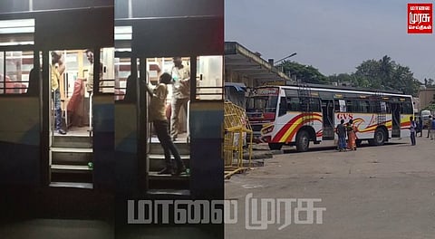 இந்த அரசு பேருந்தில் குடிபோதையில் ஒரு நபர் பயணம் செய்துள்ளார் அந்த நபரை அரசு பேருந்து நடத்துனர் பிரகாஷ் என்பவர் பேருந்தில் இருந்து இறங்க சொல்லி இருக்கிறார்.