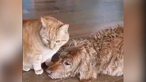 சிறு வயதில் இருந்தே தன்னுடன் ஒன்றாக வளர்ந்த நாயை பாசமாக அரவணைத்து பார்த்துக்கொள்ளும் பூனையின் காட்சிகள் இணையத்தில் வைரலாகி வருகிறது.