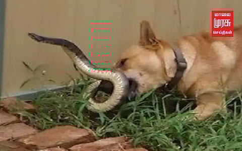 அதை கண்ட அவரது வீட்டு நாய் ஜூலி பாம்பை வீட்டுக்குள் போகாமல் துரத்தி உள்ளது. இதில் பாம்பு தேங்காய் மட்டை உள்ள பகுதியில் புகுந்து கொண்டது விடாமல் தொடர்ந்து அந்த நாய் பாம்பை துரத்தி அடித்து கடித்துக் கொன்றுள்ளது. விவசாயி வளர்த்த நாய் அதனது உயிரை துச்சம் என்று நினைத்து தனது முதலாளி குடும்பத்தை காப்பாற்றியது அப்பகுதி மக்களிடையே பரபரப்பாக பேசப்பட்டுள்ளது. தற்போது இந்த வீடியோ வைரலாக பரவி வருகிறது.