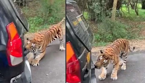 பொதுவாக விலங்குகள் வீடியோ என்றாலே சிறியவர்கள் முதல் பெரியவர்கள் வரை விரும்பி பார்த்து இணையத்தில் பகிர்ந்து வருவர். அப்படி மஹிந்திரா நிறுவனத்தின் உரிமையாளர் ஆனந்த் மஹிந்திராவால் பகிரப்பட்ட இந்த பயமுறுத்தும் வீடியோவில், ஒரு புலி ஒரு காரை கடிப்பதையும், தனது பற்களின் வலிமையால் அதை இழுப்பதையும் காணலாம்.