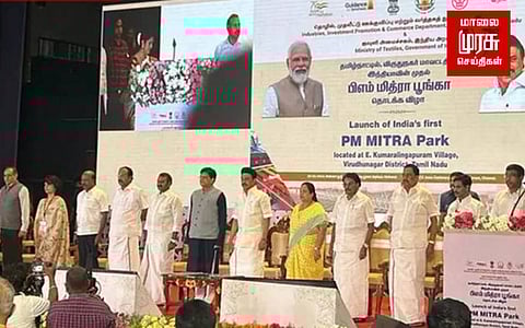 விருதுநகரில் அமைய உள்ள பிஎம் மித்ரா பூங்கா தமிழ்நாட்டில் உள்ள அனைத்து தொழில் மற்றும் ஜவுளி பூங்காக்களுக்கும் மகுடமாக திகழும் என முதலமைச்சா் மு.க.ஸ்டாலின் பெருமிதம் தொிவித்துள்ளாா்.