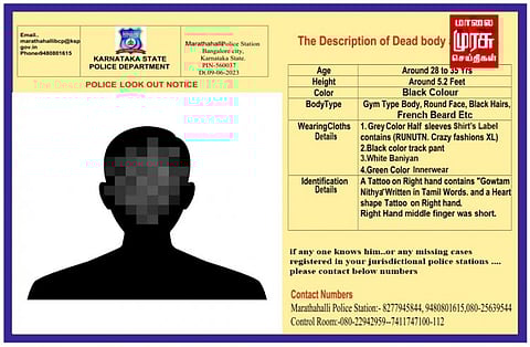 தமிழ்நாட்டை சேர்ந்த இளைஞர் ஒருவர் மர்மமான முறையில் கொலை செய்யப்பட்டு பெங்களூருவில் உடல் வீசப்பட்டுள்ள நிலையில் அவர் யார் என்று கண்டுபிடிக்க அவரது அங்க அடையாளங்களை வெளியிட்டுள்ள காவல் துறை.
