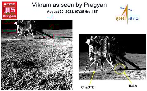 நிலவில் தரையிறங்கியதற்கு பின்னர், முதன் முதலில் விக்ரம் லேண்டரை படம்பிடித்து அனுப்பியுள்ளது பிரக்யான் ரோவர்.