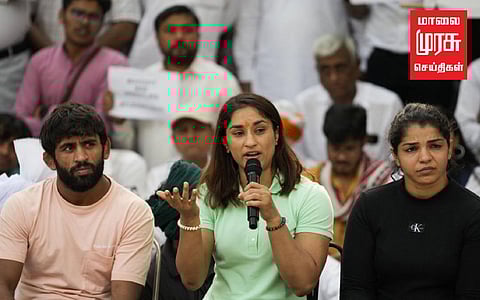 பாலியல் குற்றச்சாட்டுக்கு உள்ளான இந்திய மல்யுத்த கூட்டமைப்பின் தலைவர் பிரிஜ் பூஷனை கைது செய்ய வேண்டும், கூட்டமைப்புக்கு தேர்தல் நடத்தி பெண் தலைவரை தேர்வு செய்ய வேண்டும் உள்ளிட்ட 5 அம்ச கோரிக்கைகளை வலியுறுத்தி சாக்ஷி மாலிக், பஜ்ரங் புனியா ஆகியோர் அனுராக் தாகூரை அவரது இல்லத்தில் சந்தித்தனர். 6 மணி நேர பேச்சுவார்த்தைக்குப்பின் செய்தியாளர்களை சந்தித்த சாக்ஷி மாலிக், 15 நாட்களுக்குள் பிரச்னையை முடிவுக்குக் கொண்டு வருவதாக அமைச்சர் உறுதியளித்ததாக குறிப்பிட்டார். தொடர்ந்து ஜூன் 15ம் தேதி வரை போராட்டத்தை தற்காலிகமாக வாபஸ் பெறுவதாகவும், 15 நாட்களுக்குள் பிரச்னை தீர்க்கப்படாவிட்டால் மீண்டும் போராட்டத்தில் ஈடுபடுவோம் எனவும் தெரிவிக்கப்பட்டது.