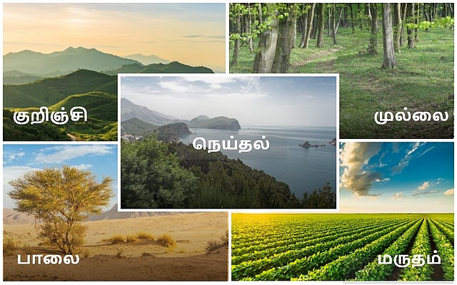 இந்த அஞ்சு நிலங்களுக்கும் அவங்க வச்சிருந்த பெயர்கள் கூட சும்மா வச்சது இல்லை. அந்தந்த நிலத்துல பூக்குற பூக்களோட பேரை தான் அந்த நிலத்துக்கு வச்சாங்க. இதுல இருந்து தமிழர்கள் இயற்கையை எந்த அளவுக்கு நேசிச்சாங்கன்னு தெரியுது. அதுமட்டுமில்லாம, ஒவ்வொரு நிலத்துக்கும் ஒரு குறிப்பிட்ட காலத்தைச் சொல்லி, அந்த நேரத்துல என்ன மாதிரியான உணர்ச்சிகள் மனித மனசுல தோணும்னு கூட அகப்பொருள் இலக்கணத்துல சொல்லி வச்சிருக்காங்க. காதல்ல இருந்து வீரம் வரைக்கும் எல்லாமே நிலத்தோட சம்பந்தப்பட்டது தான். இன்னைக்கு நாம ஏசி ரூம்ல உட்கார்ந்துகிட்டு இயற்கைன்னா என்னன்னு தெரியாம வாழ்றோம். ஆனா அன்னைக்கு தமிழன் மழையையும், வெயிலையும், மண்ணையும் நேருக்கு நேர் சந்திச்சு ஒரு உன்னதமான வாழ்க்கையை வாழ்ந்திருக்கான்.