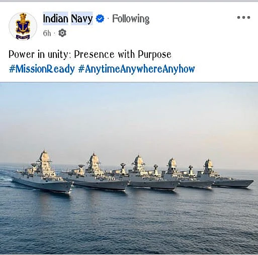 இந்தியாவில் முப்படைகளும் தயார் நிலையில் இருக்க அறிவுறுத்தப்பட்டுள்ள நிலையில், இந்திய கடற்படை 5 போர்கப்பல்களின் புகைப்படங்களை வெளியிட்டு “ஒன்று சேர்ந்து ஆற்றலை வெளிப்படுத்துவோம் தேசியப்பணிக்கு தயார்” என்ற பதிவை வெளியிட்டுள்ளது.. இதனால் எல்லையில் பொற்பாதற்றம் அதிகரித்துள்ளது.