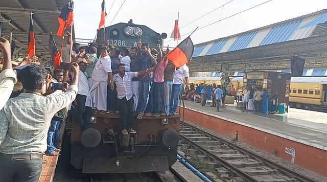 இந்த நிலையில் சம்பவத்தை கண்டிக்கும் வகையில், 100க்கும் மேற்பட்ட திமுகவினர் மதுரை ரயில் நிலையத்தில் திடீரென காவல்துறையின் தடுப்புகளை தாண்டி அத்துமீறி ரயில் நிலையத்திற்குள் நுழைந்து திருச்செந்தூர் முதல் பாலக்காடு வரை செல்லக்கூடிய ரயில் இஞ்சின் மீது ஏறி பாஜகவை கண்டித்தும், அண்ணாமலையை கண்டித்தும் கண்டன கோஷங்களை எழுப்பினர். திமுகவினர் ரயிலில் ஏறி ரயில் மறியல் போராட்டத்தில் ஈடுபட்டது ரயில்வே நிலையம் முழுவதும் பெரும் பரபரப்பை ஏற்படுத்தியது.