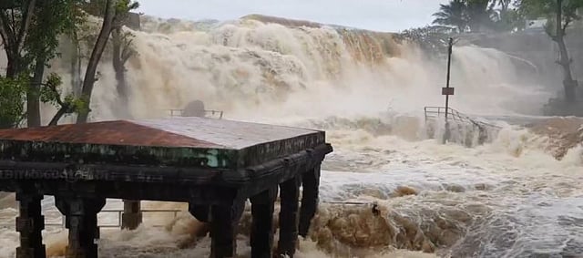 திற்பரப்பு அருவியில் வெள்ளம் தடுப்பு வேலியை தாண்டி ஆர்ப்பரித்து கொட்டுகிறது இதனால் நீச்சல்குளம், கல் மண்டபம் நீரில் மூழ்கி தண்ணீர் ஆர்ப்பரித்து செல்கிறது.