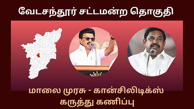 "மாலை முரசு - கான்சிலிடிக்ஸ்" இணைந்து தமிழகம் முழுவதும் நடத்திய மாபெரும் கருத்துக்கணிப்பு முடிவுகள் குறித்து "Tamil Nadu Political League" நிகழ்ச்சியில் வேடசந்தூர் தொகுதி பற்றியும், வரும் 2026 சட்டமன்ற தேர்தலில் அங்கு வெற்றிப் பெற அதிகம் வாய்ப்புள்ள கூட்டணி எது? என்பது குறித்த தகவல்கள் இங்கே விரிவாகத் தரப்பட்டுள்ளன.