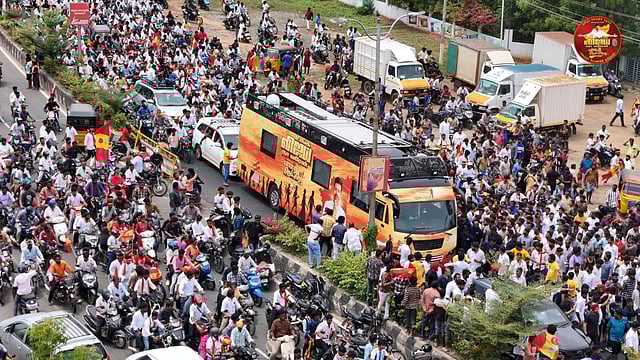 விஜயின் பிரச்சார பேருந்தை சுற்றிலும் இருசக்கர வாகனங்கள், கார்கள், மற்றும் ஆயிரக்கணக்கான ரசிகர்கள் அணிவகுத்து வருகின்றனர்.