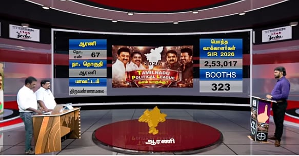 "மாலை முரசு - கான்சிலிடிக்ஸ்" இணைந்து தமிழகம் முழுவதும் நடத்திய மாபெரும் கருத்துக்கணிப்பு முடிவுகள் குறித்து "Tamil Nadu Political League" நிகழ்ச்சியில் ஆரணி தொகுதி பற்றியும், வரும் சட்டமன்ற தேர்தலில் அங்கு வெற்றிப் பெற அதிகம் வாய்ப்புள்ள கூட்டணி எது? என்பது குறித்த தகவல்கள் இங்கே தொகுக்கப்பட்டுள்ளன. திருவண்ணாமலை மாவட்டத்தின் முக்கிய அடையாளமான ஆரணி பட்டு மற்றும் ஆரணி அரிசிக்கு உலகப் புகழ்பெற்றது. பிரிட்டிஷ் காலத்துப் பழமையான நகராட்சியை உள்ளடக்கிய இந்தத் தொகுதியில், வரும் சட்டமன்றத் தேர்தலை ஒட்டி நிலவும் அரசியல் மாற்றங்கள் குறித்து விரிவான கள ஆய்வு மேற்கொள்ளப்பட்டது.