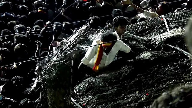 கட்டுக்கடங்காத வகையில் மக்கள் கூட்டம் விஜய்யின் பிரச்சார வாகனத்தை நோக்கி செல்ல முண்டியடித்துள்ளனர்.