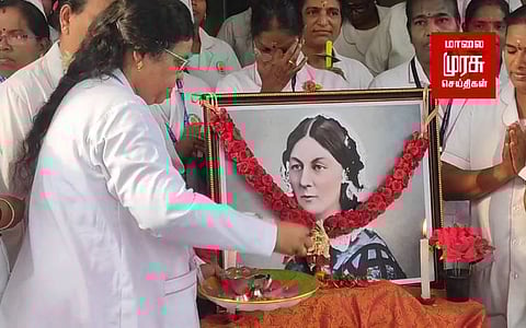 கைவிளக்கு ஏந்திய காரிகை பிலாரன்ஸ் நைட்டிங்கேல் அம்மையாரின் பிறந்தநாள் ஒவ்வொரு ஆண்டும் செவிலியர் தினமாக கொண்டாடப்படுகிறது. அதனை முன்னிட்டு தஞ்சை அரசு ராசா மிராசுதார் மருத்துவமனையில் மருத்துவ கல்லூரி மருத்துவமனை மற்றும் அரசு மருத்துவமனையில் பணியாற்றும் செவிலியர்கள் அம்மையாரின் 203 வது பிறந்தநாளை முன்னிட்டு நைட்டிங்கேல் படத்திற்கு மலர் தூவி மரியாதை செய்தனர். மேலும் மெழுகுவர்த்தி ஏந்தி உறுதிமொழி எடுத்துக் கொண்டனர்.