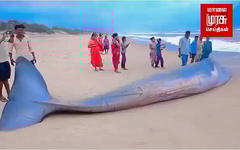 ஆந்திர மாநிலம் ஸ்ரீகாகுளம் மாவட்டம் சந்தபொம்மாலி மண்டலத்தில் உள்ள பழைய மேகவரம் - டி.மருவாடா கடற்கரைகளுக்கு இடையே நேற்று மாலை ஒரு பெரிய நீல திமிங்கலம் கரை ஒதுங்கியது.
