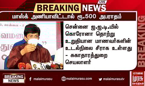 இது குறித்து செய்தியாளர் சந்திப்பில் பேசிய சுகாதாரத்துறை செயலாளர், தொடர்ந்து படிபடியாக அதிகரித்து வரும் கொரோனா தொற்றால் மீண்டும் பொதுவெளியில் மக்கள் மாஸ்க் கட்டாயம் அணியவேண்டும், அப்படி அணியாவிட்டால் ரூபாய் 500 அபராதம் என சுகாதாரத்துறை செயலாளர் இராதாகிருஷ்ணன் தெரிவித்துள்ளார்.