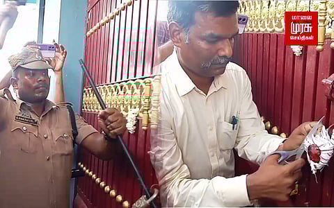 சில நாட்களுக்கு முன்பு, கரூர் மாவட்டம் தரகம்பட்டி அருகே உள்ள வீரணம்பட்டி ஸ்ரீ காளியம்மன் கோவில் திருவிழாவில் பட்டியலின இளைஞரை கோவிலின் உள்ளே விடாமல் தடுத்ததாக கூறப்பட்ட நிலையில், இரு தரப்புக்கும் இடையே மோதல் ஏற்பட்டு ஊர் கலவரம் ஆனதால், குளித்தலை ஆர்டிஓ புஷ்பாதேவி கோவிலின் கதவை பூட்டி சீல் வைத்தார்.