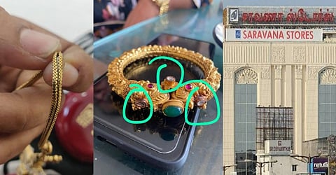 பிரபல நகை கடையான தி.நகர் சரவணா ஸ்டோரில் வாடிக்கையாளர் ஒருவர் இரண்டு முறை தங்க நகைகள் வாங்கியதும், 2 முறை வாங்கிய தங்க நகைகளிலும் வெள்ளிக் கம்பிகள் மற்றும் அரக்குகள் வைத்து வாடிக்கையாளரை சரவணா ஸ்டோர் தங்க நகை மாளிகை ஏமாற்றியதால் அதன்மீது வழக்கு பதியப்பட்டு இருப்பதும் சரவணா ஸ்டோர் தங்க நகை மாளிகை வாடிக்கையாளர்கள் இடையே பெரும் அதிர்ச்சியை ஏற்படுத்தியுள்ளது.