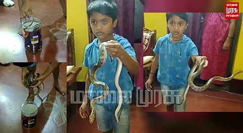 அதேசமயம் தந்தை அங்கு வந்து விட தனது மகனை தனியாக இந்த சாரை பாம்பை பிடித்து பெட்டியில் அடைக்க கூறியுள்ளார். அதை அடுத்து 9 வயது சிறுவன் சிறிதும் அச்சம் இல்லாமல் முதன்முறையாக தந்தையின் உதவி இல்லாமல் தானாகவே பாம்பை பிடித்து பெட்டியில் அடைத்தான்.