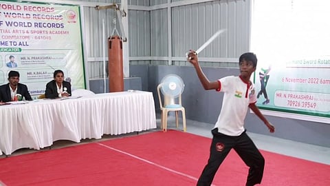 கோவை சின்ன வேடம் பட்டி பகுதியில், கடந்த 8 ஆண்டுகளக, பள்ளி மாணவ மாணவிகளுக்கு, சிலம்ப கலையை கற்று தருவது மட்டுமில்லாமல் மாணவ, மாணவிகள், கற்று கொண்ட கலையை, அனைவரும் பாராட்டும் வகையில், பல்வேறு முயற்சிகளின் அடிப்படைகளில், சாதனைகளாக மாற்றி அனைவரும் வியந்து போற்றும் வகையில் சாதனை பக்கங்களில் இடம் பிடிக்க செய்து வருகிற முல்லை மார்ஷியல் ஆர்ட்ஸ் மற்றும் ஸ்போர்ட்ஸ் அகாடமி அமைப்பினர் இன்று துடியலூர் அடுத்த என்ஜிஜிஒ காலனி பகுதியில், அழகர் சாமி, கீதா, தம்பதியினரின் கார்த்திக்(14) கடந்த ஒரு ஆண்டுகளாக சிலம்பகலைகளை கற்று வருகிறார்.