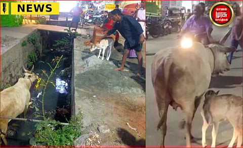 போடி பழைய பேருந்து நிலையம் அருகே கன்றுடன் இருந்த பசுமாட்டிடம் காளைமாடு ஒன்று தனது வீரத்தை காட்ட தாய்பசுவை நோக்கி வந்தபோது, கன்றுக்குட்டி காளைமாட்டை நோக்கி ஆக்ரோசமாக செல்லவே தனது கன்றுக்குட்டியை காப்பாற்ற காளைமாட்டுடன் சண்டையிட்ட பசுமாட்டை காளைமாடு தாக்கியதில் சாலை ஓரம் இருந்த சாக்கடை பள்ளத்தில் தவறி விழுந்தது. இதை கவனித்த அப்பகுதி பொதுமக்கள் தீயணைப்புத்துறையினருக்கு தகவல் தெரிவிக்கவே, விரைந்து வந்த தீயணைப்புத்துறையினர் உடனடியாக பசுவை சற்று மேடான பகுதிக்கு கன்றுகுட்டியை காட்டி அழைத்து வந்து மாட்டை மீட்டு கன்றுக்குட்டியுடன் அனுப்பி வைத்தனர். தனது கன்றுக்குட்டிக்கு ஆபத்து என அறிந்து காளையிடம் சண்டையிட்டு சாக்கடையில் விழுந்த பசுமாட்டினை தீயணைப்புத்துறையினருடன் இணைந்து, அப்பகுதியில் உள்ள பொதுமக்களும் உணர்ச்சி பெருக்குடன் பசுவை மீட்டு அதன் கன்றுக்குட்டியுடன் அனுப்பி வைத்தனர்.