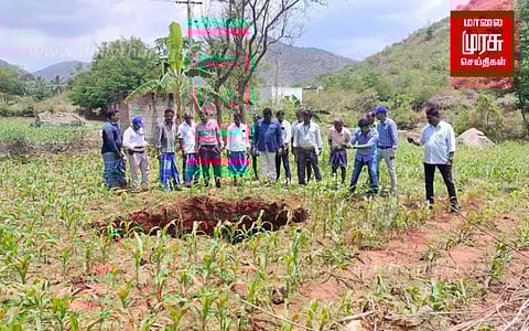திருப்பத்தூர் மாவட்டம் வாணியம்பாடி அருகே கூவல்குட்டை கிராமத்தை சேர்ந்த விவசாயி முருகேசன். இவருக்கு சொந்தமான விவசாய நிலம் மலையடிவார பகுதியை ஒட்டி உள்ளது. அதில் மக்காச்சோளம் பயிரிட்டுள்ளார். வழக்கம் போல கடந்த 20.03.2023ம் தேதி காலை விவசாய நிலத்திற்கு தண்ணீர் பாய்ச்சுவதற்காக முருகேசன் சென்றுள்ளார். அப்போது விவசாய நிலத்தில் அதிக சப்தத்துடன் திடீரென 30 அடி ஆழம் மற்றும் 15 அகலத்தில் திடீரென்று பள்ளம் ஏற்பட்டு விவசாய நிலம் உள்வாங்கியது.