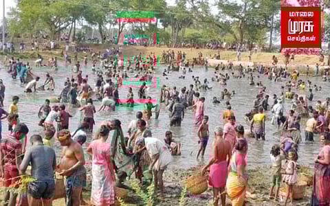 புதுக்கோட்டை மாவட்டம் அன்னவாசல் அருகே உள்ள புதூர் கிராமத்தில் உள்ள பெரிய மற்றும் சின்ன கண்மாயில் 5000க்கும் மேற்பட்ட பொதுமக்கள் மீன்பிடித் திருவிழாவில் கலந்து கொண்டு உற்சாகமாக மீன்களைப் பிடித்து வருகின்றனர்.