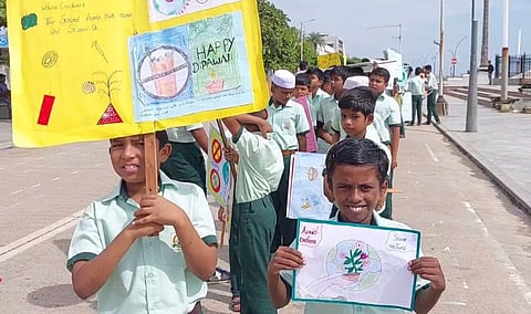 தனியார் கல்வி நிறுவனம் சார்பில் மாசு மற்றும் அதிக சத்தம் இல்லா தீபாவளியை அனைவரும் கொண்டாட வேண்டும் என்பதை வலியுறுத்தி நடைபெற்ற விழிப்புணர்வு பேரணியில் பள்ளி மாணவர்கள் கலந்துகொண்டு விழிப்புணர்வு ஏற்படுத்தினர்