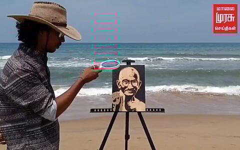 மயிலாடுதுறை மாவட்டம் தரங்கம்பாடியில் இளைஞர் ஒருவா் மரப்பலகையில் காந்தியின் உருவப்படத்தை பூதக்கண்ணாடியால் குவித்து வரைந்து அசத்தியுள்ளார்.