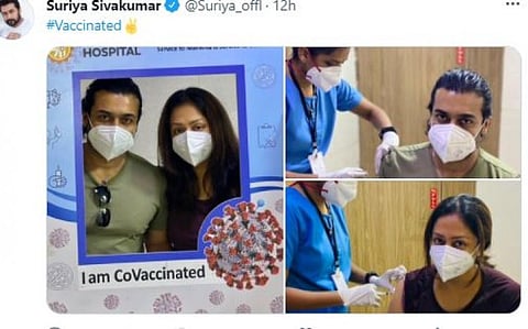 அந்த வகையில் பிரபல தமிழ் திரைப்பட நடிகர் சூர்யா மற்றும் அவரது மனைவியும் நடிகையுமான ஜோதிகா ஆகியோர் கொரோனா தடுப்பூசி செலுத்திக் கொண்டனர். இருவரும் முதல் டோஸை செலுத்திக்கொண்டனர். மேலும் அனைவரும் தடுப்பூசி செலுத்திக் கொள்ள முன்வர வேண்டும் எனவும் அவர்கள் வலியுறுத்தியுள்ளனர். தடுப்பூசி போடும் புகைப்படத்தை அவர் தனது டிவிட்டர் பக்கத்தில் பதிவிட்டுள்ளார்.