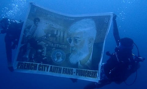 அமராவதியில் தொடங்கி, இன்று வலிமை வரை இவரது நடிப்பில் 60 க்கும் மேலான திரைப்படங்களில் நடித்துள்ள இவர், திரை பயணத்தில் 30 ஆண்டுகளை கடந்துள்ளார். அதனை கொண்டாடும் விதமாக அவரது ரசிகர்கள் பல செயல்களை செய்து வருகின்றனர். அந்த வகையில், புதுச்சேரி ப்ரேஞ்ச் சிட்டி அஜித்குமார் ரசிகர்கள் சார்பாக நடிகர் அஜித்தின் 30ஆம் ஆண்டு திரையுலக பயணத்தை முன்னிட்டுஆழ்கடல் நீச்சல் என்று சொல்லக்கூடிய ஸ்கூபா டைவிங் மூலம் கடலுக்கு அடியில் பேனர் வைத்து அவரின் திரையுலக பயணத்தை பிரமாண்டமாக வரவேற்றுள்ளனர். இது பலரின் கவனத்தையும் பெற்றுள்ளது.