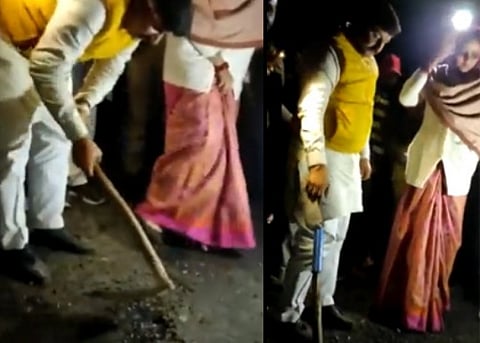 அப்போது, தேங்காய்க்கு பதிலாக புதிய தார்சாலை, சிறு-சிறு துண்டுகளாக சிதறியது. இதனால் வருத்தம் அடைந்த பா.ஜ.க. எம்.எல்.ஏ., சாலையின் தரத்தை மண்வெட்டியால் சோதனை செய்தார். இதனையடுத்து, சாலை தரமற்று இருப்பதை கண்டறிந்த அவர், இதற்கு காரணமானவர்கள் மீது கடும் நடவடிக்கை எடுக்கப்படும் என உறுதி அளித்துள்ளார்.