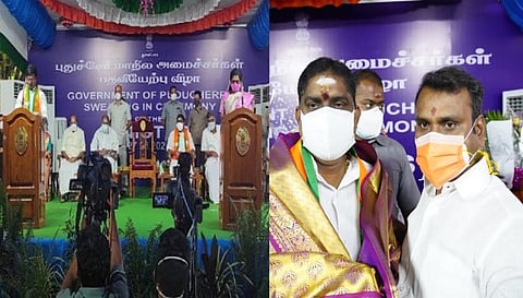 இவர்களுக்கு புதுச்சேரி துணைநிலை ஆளுநர் தமிழிசை சௌந்தரராஜன் பதவி பிரமாணம் செய்துவைத்தார். அப்போது "இந்திய ஒன்றியத்தின் புதுச்சேரி ஆட்சி பரப்பின் அமைச்சர் என்ற வகையில் கடமையாற்றுவேன்" என்று ஆளுநர் தெரிவிக்க, அதை பாஜக, என்.ஆர்.காங்கிரஸ் அமைச்சர்களும் அப்படியே கூறி பதவியேற்றனர். குறிப்பாக, " இந்திய ஒன்றியம்" என்று ஆளுநர் கூற அதை பதவியேற்ற அமைச்சர்களும் திருப்பிக்கூறினர்.