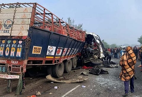 லாரியும், பேருந்தும் நேருக்கு நேர் மோதி கொண்ட கோர விபத்தில் 7 பேர் சம்பவ இடத்திலேயே உயிரிழந்தனர். மேலும், 24 பேர் படுகாயமடைந்தனர். தகவலறிந்து சம்பவ இடத்திற்கு விரைந்து சென்ற போலீசார் மீட்புக்குழுவினரின் உதவியுடன் படுகாயமடைந்தவர்களை மீட்டு அருகில் உள்ள மருத்துவமனையில் அனுமதித்தனர்.