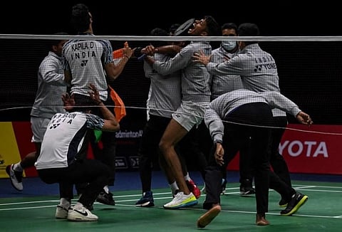 தாமஸ் கோப்பைக்கான பேட்மிண்டன் போட்டி, தாய்லாந்தின் தலைநகர் பாங்காக்கில் நடைபெற்று வருகிறது. இதில் அரையிறுதி போட்டியில் முன்னாள் சாம்பியனான டென்மார்க்கை எதிர்கொண்ட இந்திய அணி, போராடி 3-க்கு 2 என்ற கோல் கணக்கில் வெற்றிப்பெற்றது.