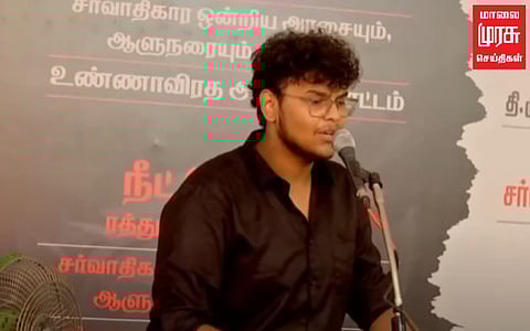 அப்போது பேசிய அவர், எனக்கு 19 வயது தான். நான் மத்திய அரசிற்கும் நீட் தேர்வுக்கு எதிராக பேசியதை பார்க்கும் பாஜகவினர் என் மீது ED Raid நடத்த வேண்டும் என சொல்கின்றனர். உங்களுக்கு (பாஜகவினருக்கு) என் மீது மாற்று கருத்து இருந்தால் என்னுடைய கருத்தியல் உடன் மோதுங்கள். ஆனால் என்னை அச்சுறுத்த நினைக்காதீர்கள் எனக் கூறினார்