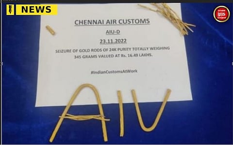 துபாயில் இருந்து சூட்கேஸ் கைப்பிடியில் கம்பி போல் கடத்தி வந்த ரூ.16 லட்சத்தி 49 ஆயிரம் மதிப்புள்ள 345 கிராம் தங்கம் பறிமுதல் செய்யப்பட்டு வாலிபர் கைது.