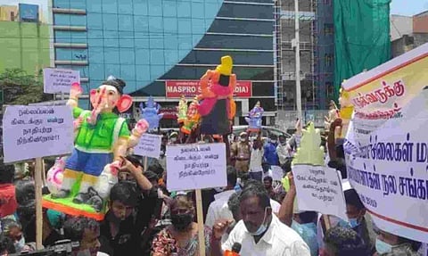 விநாயகர் சதுர்த்தி விழா தொடர்பாக பொது இடங்களில் சிலைகளை நிறுவுவது, பொது இடங்களில் விழாவை கொண்டாடுவது ஆகியவற்றிற்கு அனுமதி மறுக்கப்பட்டுள்ளதால் நேற்று சட்டசபை கூட்டத்தொடர் நடந்து வரும் கலைவாணர் அரங்கத்தின் பிரதான வாயில் முன்பு, வாலாஜா சாலையில், தமிழ்நாடு கைவினை காகிதகூழ் விநாயகர் சிலைகள் மற்றும் களிமண் பொம்மைகள் தயாரிப்பாளர்கள் நல சங்கத்தினர் விநாயகர் சிலைகளுடன் சென்று சாலைமறியல் போராட்டத்தில் ஈடுபட்டனர்.