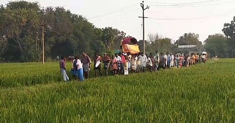 இதன் காரணமாக அங்குள்ள, ஓர் வயல் வழி பாதையில் உடலை எடுத்துச் சென்றனர். மேலும் தங்கள் பகுதி மக்களுக்கு உரிய மயான பாதை அமைத்து தர வேண்டும் எனவும் மாவட்ட ஆட்சியரிடம் பொதுமக்கள் கோரிக்கை விடுத்துள்ளனர்.