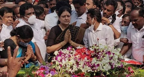 மறைந்த முன்னாள் முதலமைச்சர் ஜெயலலிதாவின் 5-ம் ஆண்டு நினைவு தினம் இன்று அனுசரிக்கப்படுகிறது. இதையொட்டி சென்னை மெரினாவில் உள்ள ஜெயலலிதா நினைவிடம் மலர்களால் அலங்கரிக்கப்பட்டுள்ளது. இந்தநிலையில் ஜெயலலிதா நினைவிடத்தில் வி.கே.சசிகலா மலர் தூவி கண்ணீர் மல்க அஞ்சலி செலுத்தினார். அதன் பின்னர் ஜெயலலிதாவின் ஆட்சியை மீண்டும் அமைப்போம் என உறுதி மொழி ஏற்றார்.
