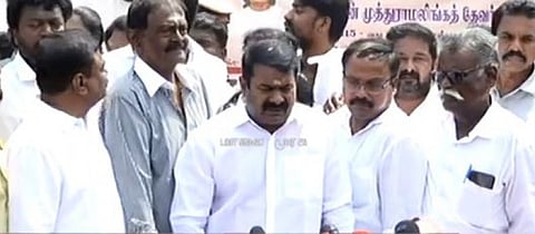 தேவர் ஜெயந்தியை முன்னிட்டு முத்துராமலிங்க தேவரின் சிலைக்கு மரியாதை செலுத்திய சீமான் ஒரே நாடு ஒரே மொழி குறித்து பேசினார்.